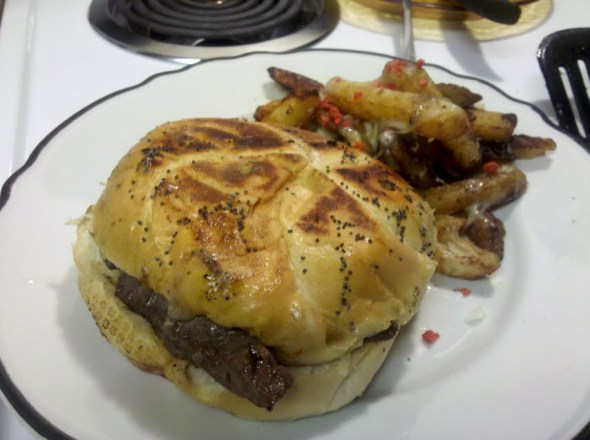 Red wine marinated organic steak. Pepperjack cheese fries.