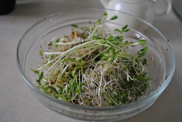 Organic alfalfa, arugula, red lentils, French lentils, peas